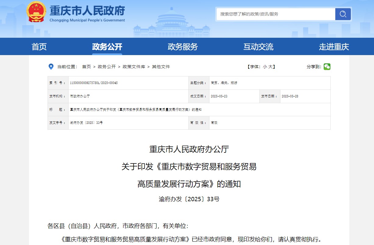 2025年5月28日,重庆市人民政府办公厅发布《重庆市数字贸易和服务贸易高质量发展行动方案》(以下简称《通知》)。《通知》明确: