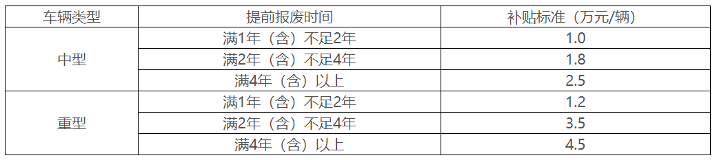 2.提前报废老旧营运货车,并新购营运货车补贴标准按以下方法计算。