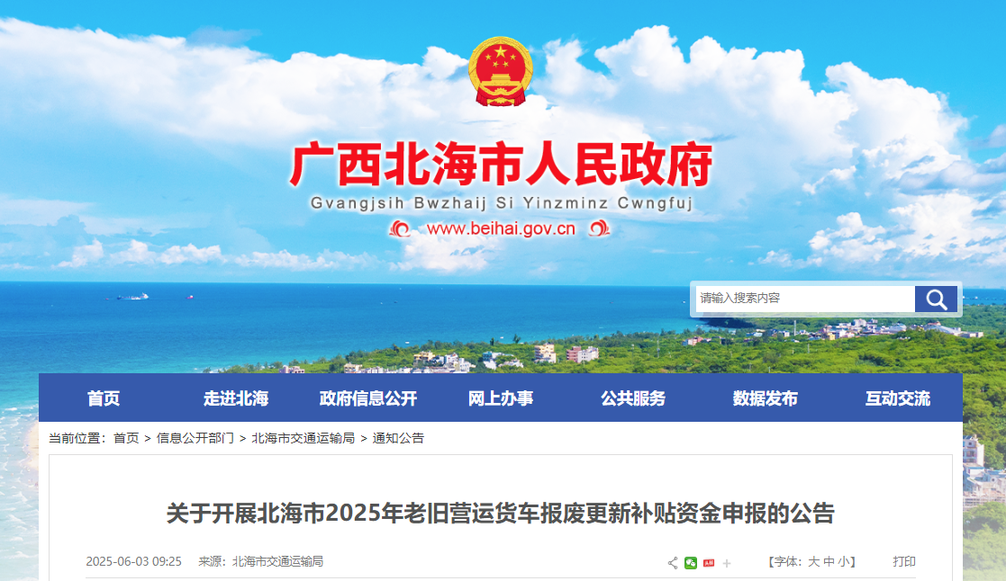 根据广西壮族自治区交通运输厅等5部门联合印发的《2025年老旧营运货车报废更新实施细则》(桂交运输发〔2025〕13号)要求,为加快推进交通运输设备更新和老旧营运柴油货车报废更新工作,现就北海市2025年老旧营运货车报废更新补贴资金申报事项公告如下: