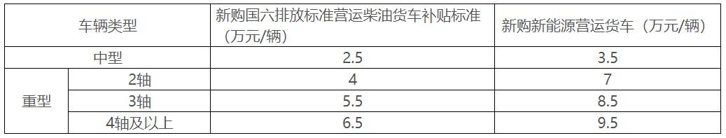 其中,新购国六排放标准营运柴油货车或新能源营运货车补贴标准见表2.