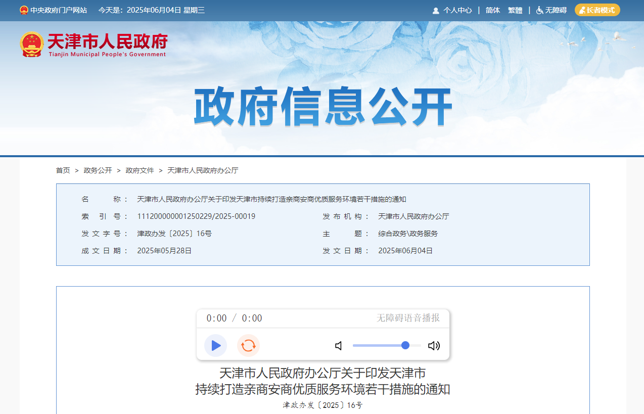 2025年6月4日,天津市人民政府办公厅发布《天津市持续打造亲商安商优质服务环境若干措施》(下称《措施》),《措施》明确: