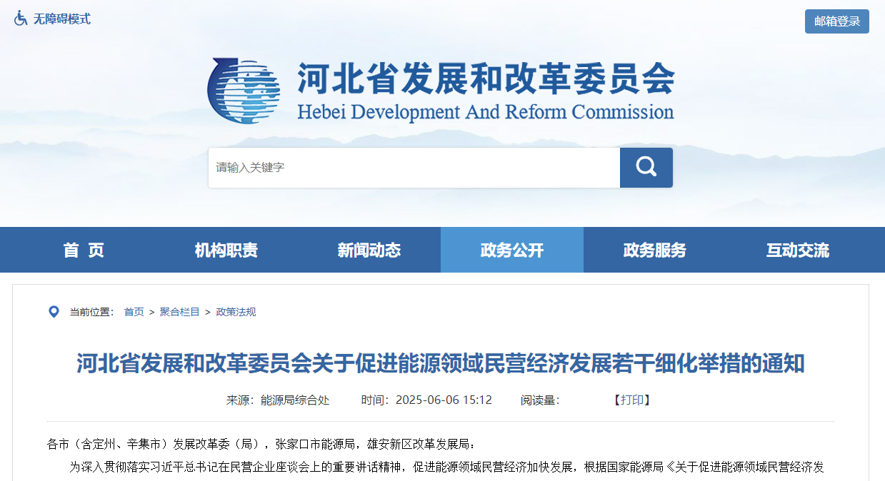 2025年6月6日,河北省发展和改革委员会发布《关于促进能源领域民营经济发展若干细化举措》(下称《举措》),《举措》明确:支持民营企业参与充电基础设施建设运营。拓展多元化投融资模式,通过招商引资、政策支持吸引各类社会资本参与充电设施建设。推广V2G、有序充电、光储充一体化等新技术新模式示范应用,鼓励民营企业参与农村地区充电设施建设。不断优化项目备案、电网接入、行业标准等营商环境,积极构建统一开放、竞争有序的充电服务市场。