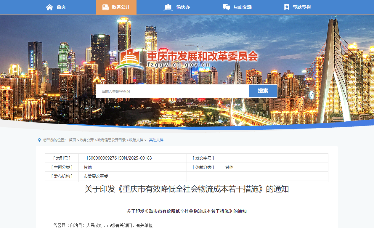 2025年6月13日,重庆市发展和改革委员会等七部门联合发布《重庆市有效降低全社会物流成本若干措施》(下称《措施》),《措施》明确: