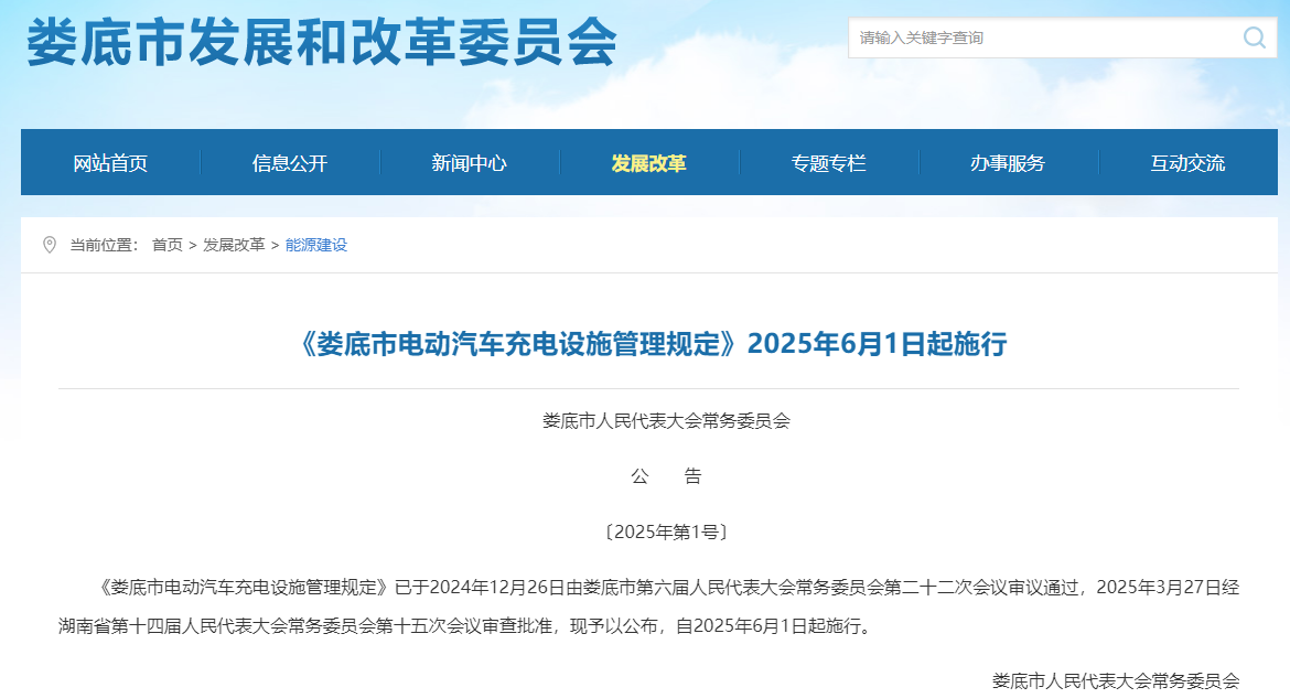 2025年6月17日,娄底市人大常委会发布《娄底市电动汽车充电设施管理规定》(下称《规定》)。《规定》明确: