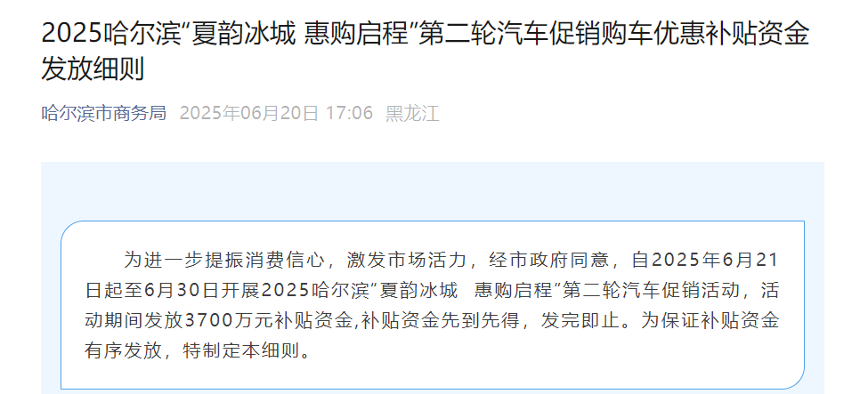 本轮市政府购车补贴资金发放完毕后,2025哈尔滨“夏韵冰城 惠购启程”第二轮汽车促销购车补贴资金发放实施细则即废止。