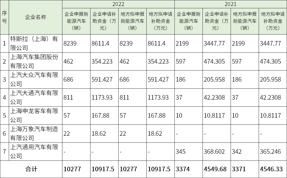 上海市申报2021—2022年度新能源汽车 推广应用补助资金情况公示