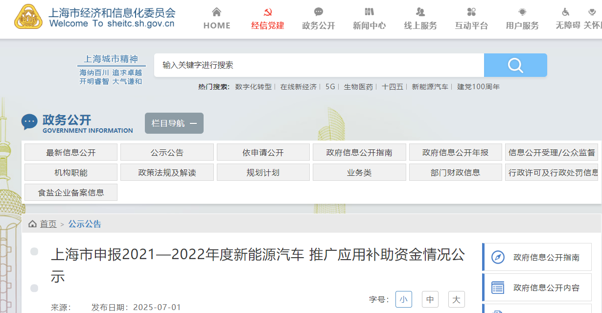 2025年7月1日——7月7日,上海市经济和信息化委员会发布《上海市申报2021—2022年度新能源汽车 推广应用补助资金情况公示》(以下简称《公示》),《公示》明确:按照清算通知要求,经财务审查、资料审核和实地抽查,特斯拉(上海)有限公司、上海汽车集团股份有限公司、上汽大众汽车有限公司、上汽大通汽车有限公司、上海申龙客车有限公司、上海万象汽车制造有限公司、上汽通用汽车有限公司7家企业的13648辆新能源汽车满足申报要求。