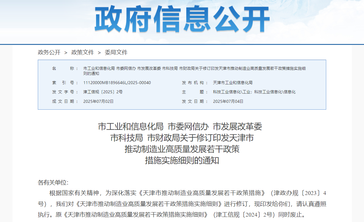 2025年7月4日,天津市工业和信息化局、市委网信办、市发展改革委、市科技局、市财政局联合修订印发《天津市推动制造业高质量发展若干政策措施实施细则》(以下简称《细则》),《细则》明确: