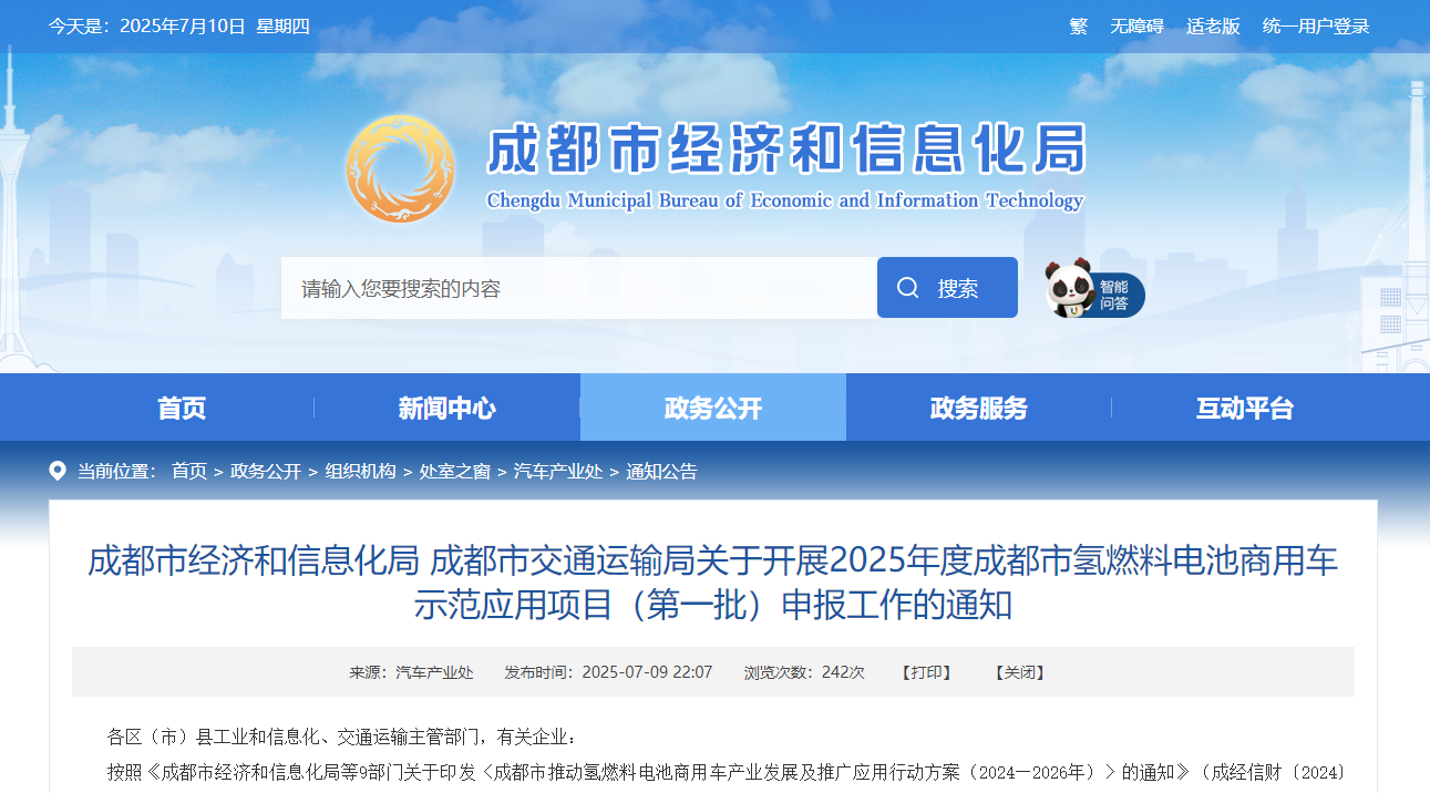 成都市经济和信息化局、成都市交通运输局近日联合发布《关于开展2025年度成都市氢燃料电池商用车示范应用项目(第一批)申报工作的通知》,《通知》明确: