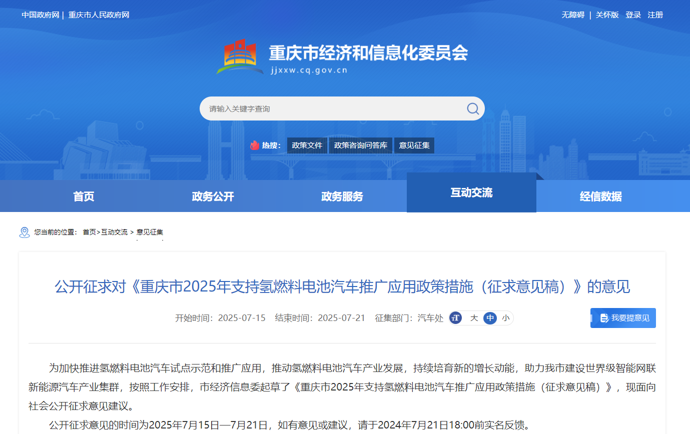 为加快推进氢燃料电池汽车试点示范和推广应用,推动氢燃料电池汽车产业发展,持续培育新的增长动能,助力重庆市建设世界级智能网联新能源汽车产业集群,按照工作安排,重庆市经济信息委起草了《重庆市2025年支持氢燃料电池汽车推广应用政策措施(征求意见稿)》,现面向社会公开征求意见建议。要求于7月21日18:00前实名反馈。《征求意见》明确: