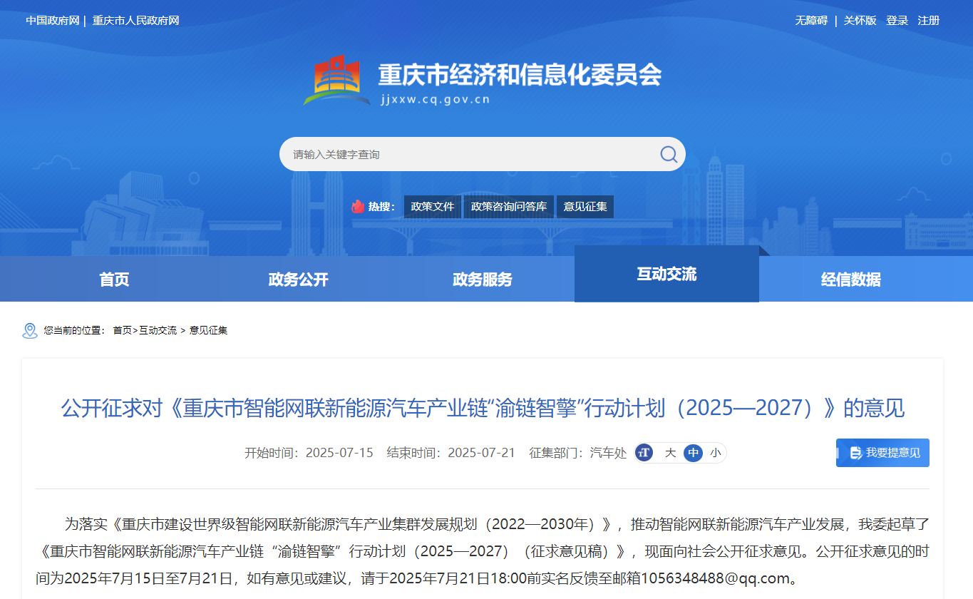 为落实《重庆市建设世界级智能网联新能源汽车产业集群发展规划(2022—2030年)》,推动智能网联新能源汽车产业发展,重庆市经济和信息化委员会起草了《重庆市智能网联新能源汽车产业链“渝链智擎”行动计划(2025—2027)(征求意见稿)》,现面向社会公开征求意见。要求于7月21日18:00前实名反馈意见或建议。《征求意见》明确: