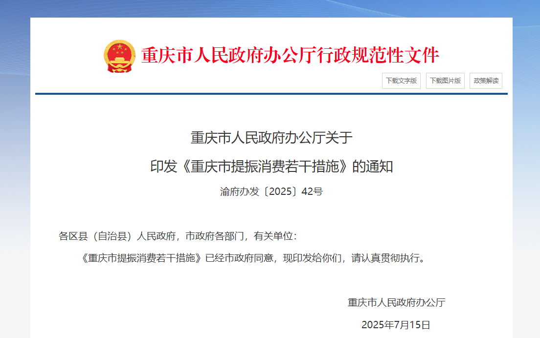 重庆市人民政府办公厅近日发布《重庆市提振消费若干措施》,《措施》明确: