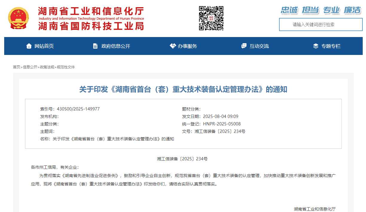 为鼓励和引导企业自主创新,规范省首台(套)重大技术装备的认定管理,加快推动重大技术装备创新发展和推广应用,湖南省工业和信息化厅现将《湖南省首台(套)重大技术装备认定管理办法》(以下简称《办法》)印发给各市州工信局,有关企业,要求结合实际认真贯彻落实。《办法》明确: