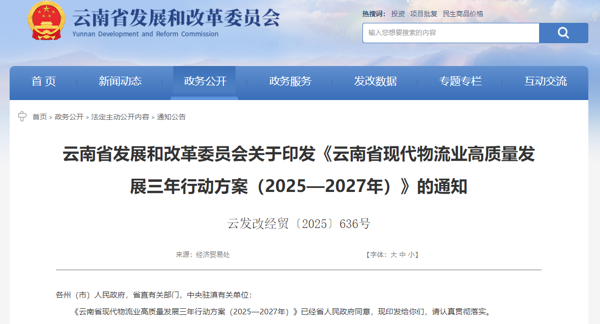 为接续实施现代物流业发展三年行动,加强交通物流大通道建设,云南省发展和改革委员会制定《云南省现代物流业高质量发展三年行动方案(2025—2027年)》(以下简称《方案》)并于近日发布。《方案》明确: