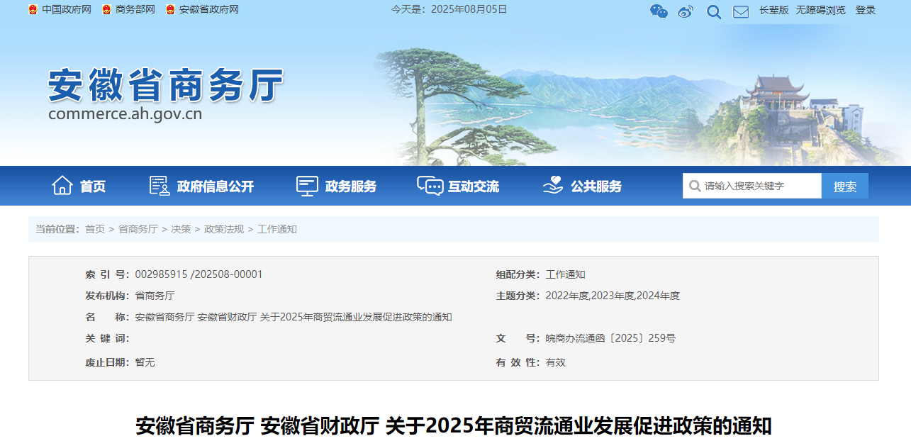 安徽省商务厅 安徽省财政厅 关于2025年商贸流通业发展促进政策的通知