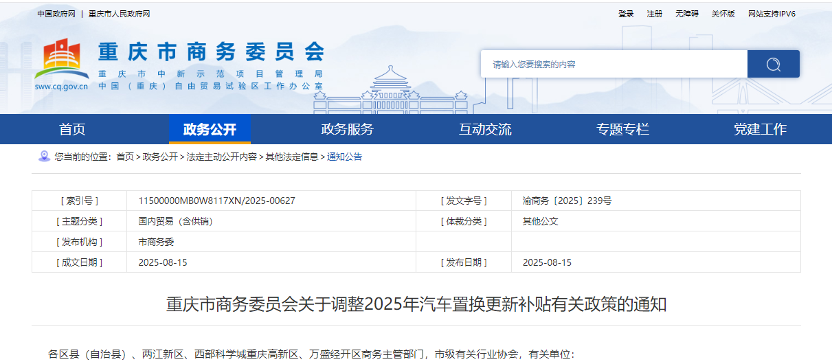 根据近期国家部委有关要求,结合重庆市政策执行实际,为有序实施好汽车置换更新补贴政策,重庆市商务委员会发布《关于调整2025年汽车置换更新补贴有关政策的通知》(以下简称《通知》),《通知》提到:重庆市第一阶段汽车置换更新补贴资金已使用完毕,为持续发挥政策激励作用,现追加安排3亿元预算资金用于2025年三季度汽车置换更新补贴,并采取分月投放方式执行。2025年8月、9月分别安排2亿元、1亿元预算额度,实行“总额控制、先报先得、用完即止”的申报原则。
