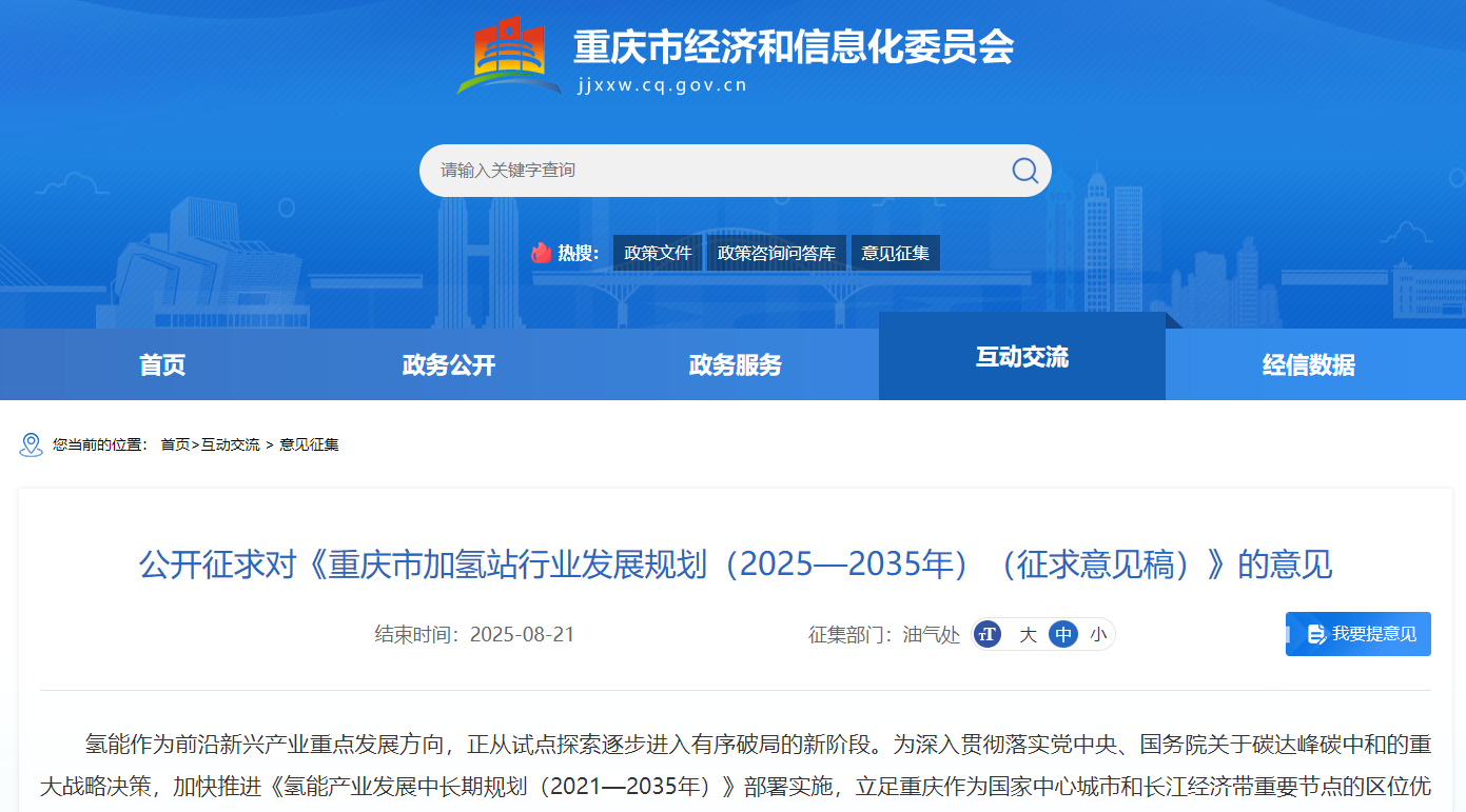 为深入贯彻落实党中央、国务院关于碳达峰碳中和的重大战略决策,加快推进《氢能产业发展中长期规划(2021—2035年)》部署实施,立足重庆作为国家中心城市和长江经济带重要节点的区位优势,以“构建西部氢能枢纽、引领区域能源变革”为核心目标,结合《重庆市氢燃料电池汽车产业发展指导意见》,重庆市经济信息委编制了《重庆市加氢站行业发展规划(2025—2035年)(征求意见稿)》,现面向社会公开征求意见建议。