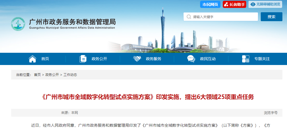 国家数据局等四部门于2024年5月联合印发《关于深化智慧城市发展推进城市全域数字化转型的指导意见》,着力推进城市全域数字化转型。2024年12月,广州市入选广东省城市全域数字化转型市级试点城市。