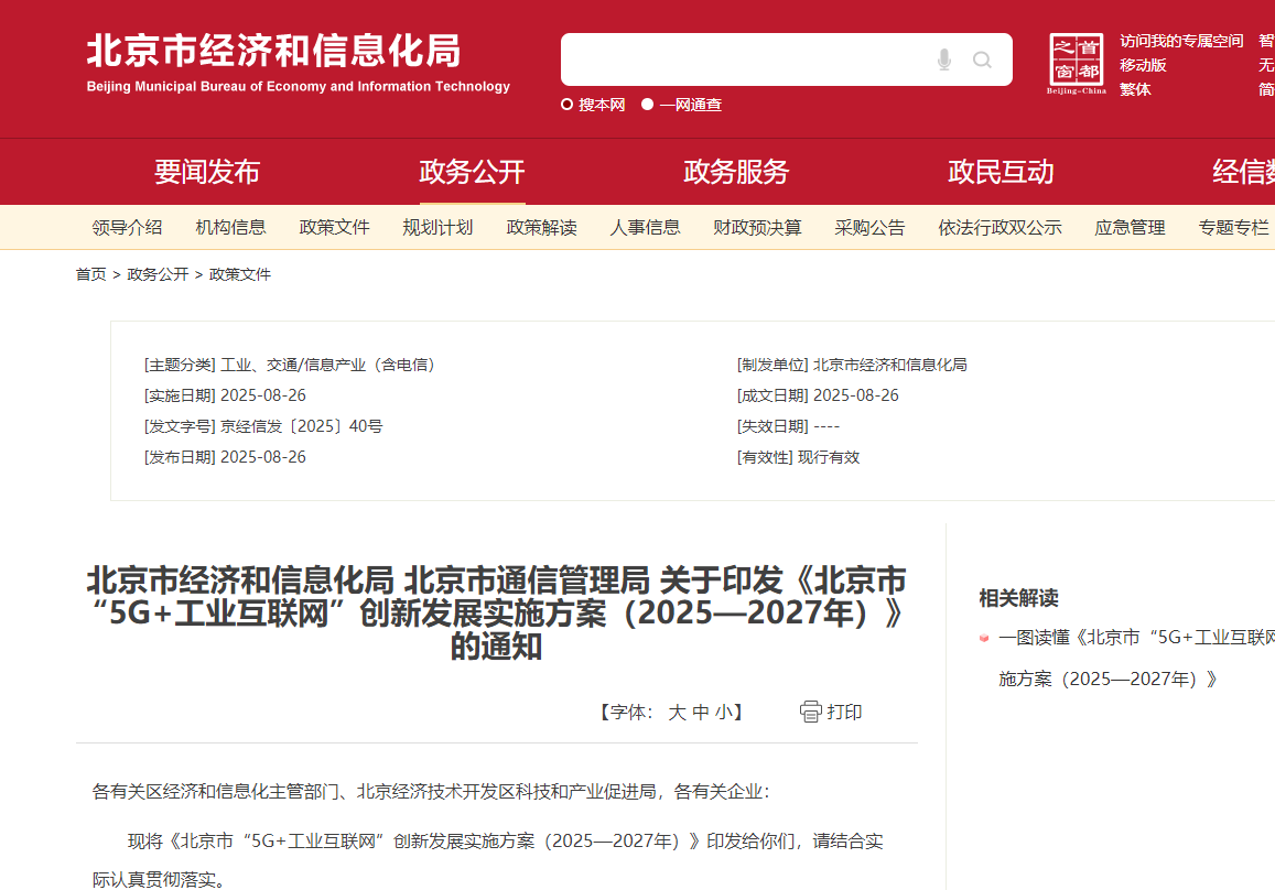北京市“5G+工业互联网”创新发展实施方案(2025—2027年)
