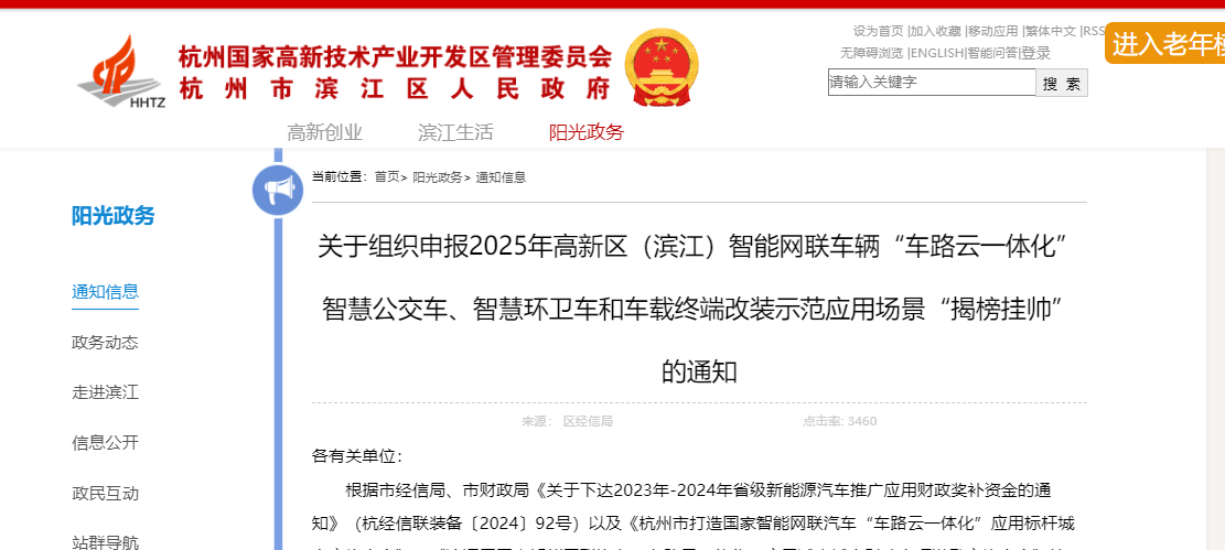 根据市经信局、市财政局《关于下达2023年-2024年省级新能源汽车推广应用财政奖补资金的通知》(杭经信联装备〔2024〕92号)以及《杭州市打造国家智能网联汽车“车路云一体化”应用标杆城市实施方案》、《滨江区国家智能网联汽车“车路云一体化”应用试点城市财政专项激励实施方案》等文件精神,结合滨江区智能网联汽车“车路云一体化”应用试点1.0阶段示范应用场景建设情况。经研究,现组织申报2025年高新区(滨江)智能网联车辆“车路云一体化”智慧公交车、智慧环卫车和车载终端改装示范应用场景“揭榜挂帅”,有关事项通知如下: