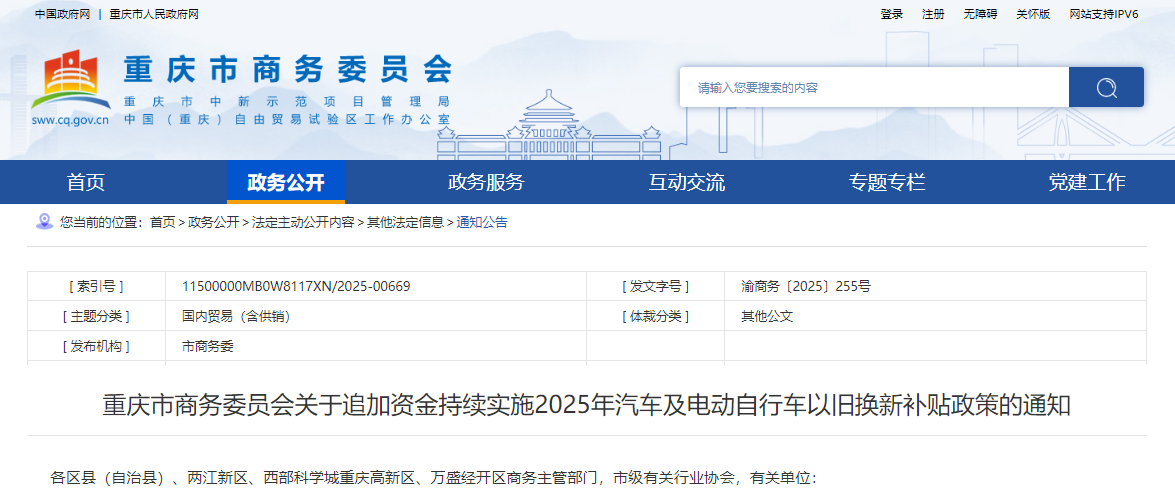 重庆市商务委员会关于追加资金持续实施2025年汽车及电动自行车以旧换新补贴政策的通知