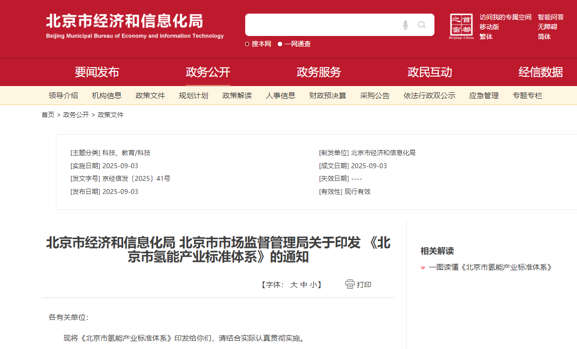 北京市氢能产业在科技创新、产业发展和示范应用等方面居国内领先地位,在氢能产业标准化建设方面具备先发优势,为进一步适应北京市氢能产业发展阶段和标准建设需求,推进市氢能产业标准化工作,北京市经济和信息化局、北京市市场监督管理局组织制定了《北京市氢能产业标准体系》现予以发布。