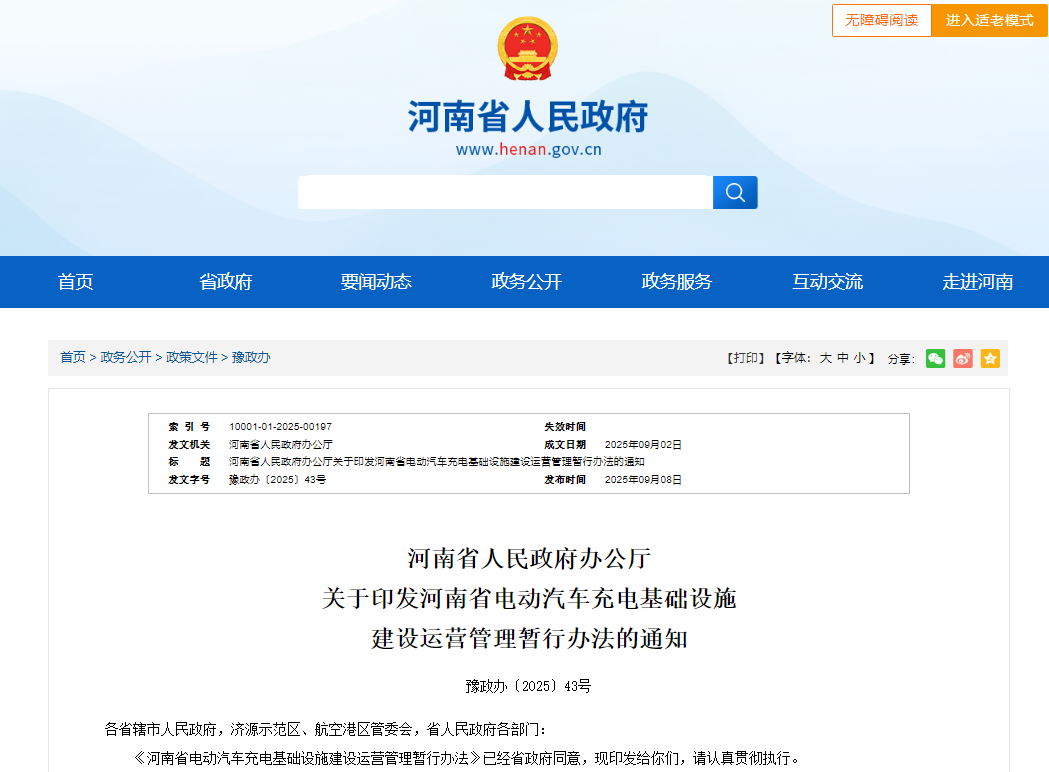 9月8日,为规范本省电动汽车充电基础设施(以下简称充电基础设施)建设、运营和管理,加快构建覆盖广泛、规模适度、结构合理、功能完善的高质量充电基础设施体系,促进电动汽车推广应用,助力实现“双碳”目标,根据《国务院办公厅关于进一步构建高质量充电基础设施体系的指导意见》(国办发〔2023〕19号)等文件精神,结合本省实际,河南省人民政府办公厅制定《河南省电动汽车充电基础设施建设运营管理暂行办法》(以下简称《办法》)并于近日发布。