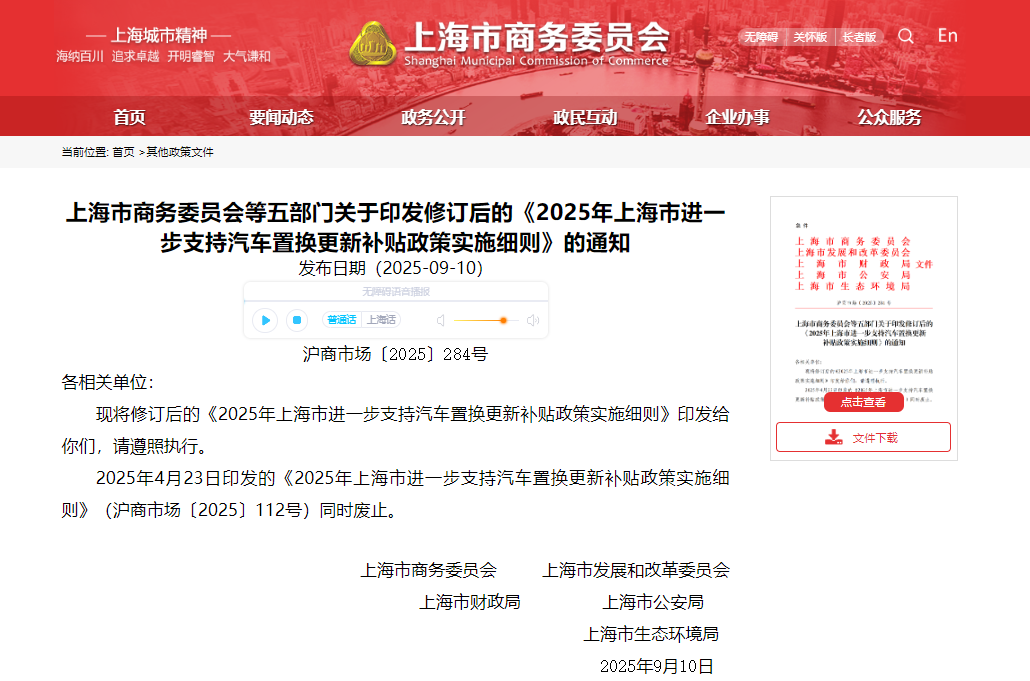 根据上海市汽车以旧换新补贴政策实施情况,经研究决定,上海市商务委员会对《2025年上海市进一步支持汽车置换更新补贴政策实施细则》(沪商市场〔2025〕112号)进行修订。调整事项具体如下: 对新车购买时间自2025年9月11日起(含当日,以《机动车销售统一发票》载明的开票日期为准)的个人消费者,所购新车应当在上海市进行注册登记。