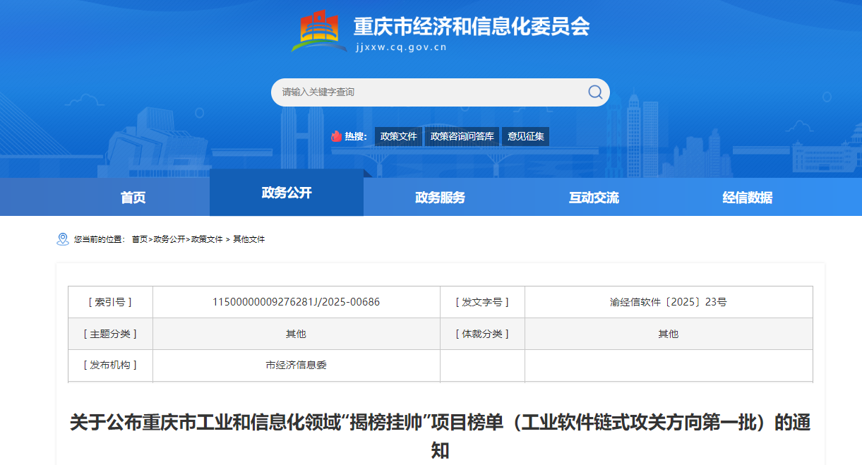 为认真贯彻《重庆市软件和信息服务业“满天星”行动计划(2022—2025年)》(渝府办〔2022〕21号)要求,加快工业软件和工业操作系统工具链创新发展,推动软件企业与制造业深度融合,经研究,发布重庆市工业和信息化领域“揭榜挂帅”项目榜单(工业软件链式攻关方向第一批)。现将有关事项通知如下。