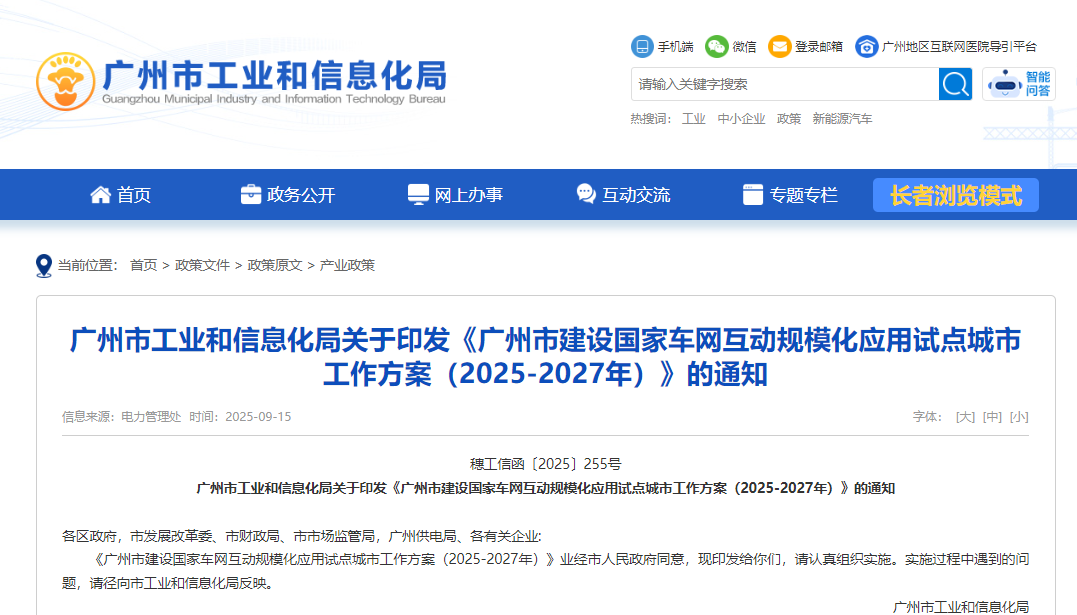 为深入贯彻落实国家“双碳”战略和新型能源体系建设部署,根据相关政策要求,加快推动国家车网互动规模化应用试点城市建设,结合广州市实际,广州市工业和信息化局制定《广州市建设国家车网互动规模化应用试点城市工作方案(2025-2027年)》(以下简称《方案》)并于近日发布,重点任务方面,《方案》明确: