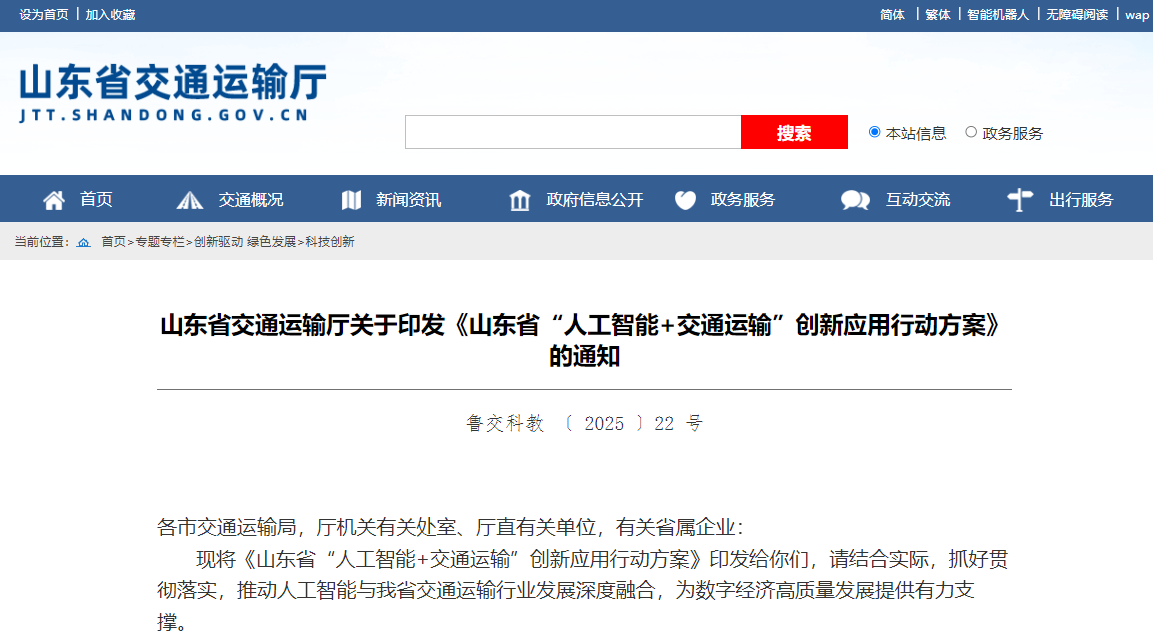 山东省“人工智能+交通运输”创新应用行动方案