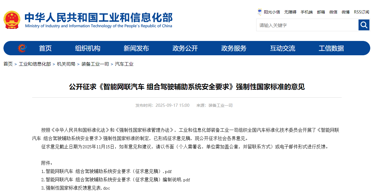 工信部就《智能网联汽车 组合驾驶辅助系统安全要求》强制性国家标准公开征求意见