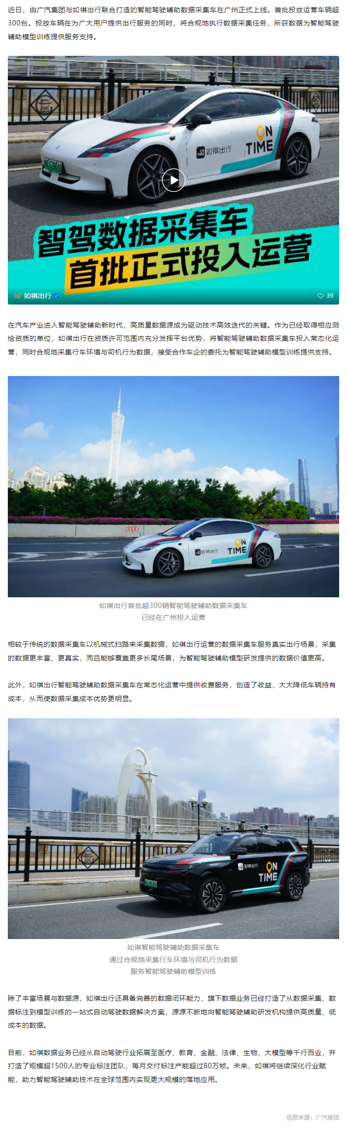广汽集团与如祺出行联合打造的智能驾驶辅助数据采集车在广州正式上线