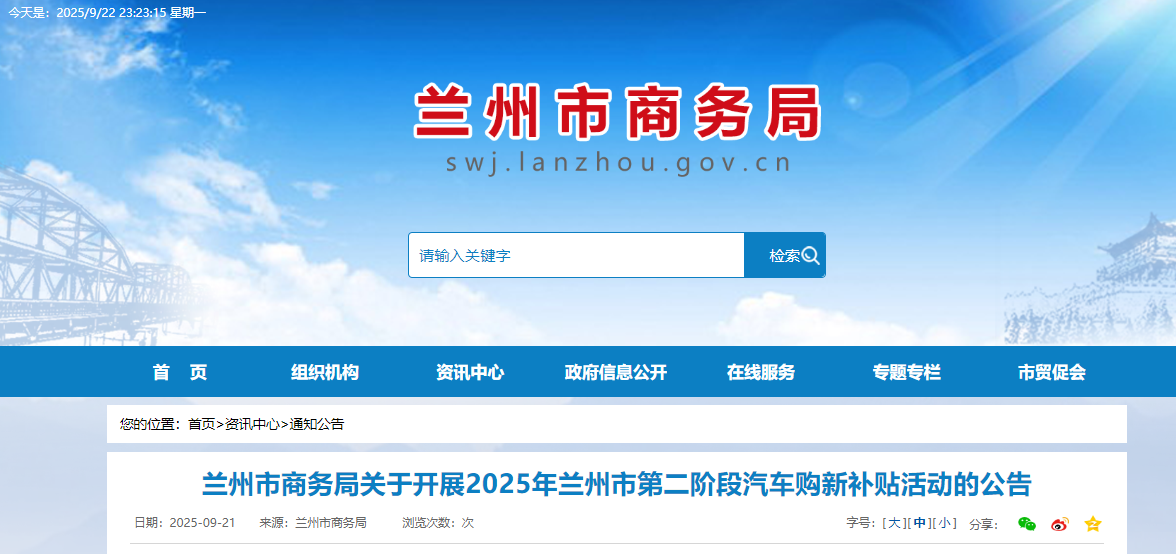 为贯彻落实《兰州市2025年提振消费专项行动实施方案》,激发汽车消费市场活力,兰州市商务局决定启动2025年兰州市第二阶段汽车购新补贴活动,现将有关事宜公告如下。
