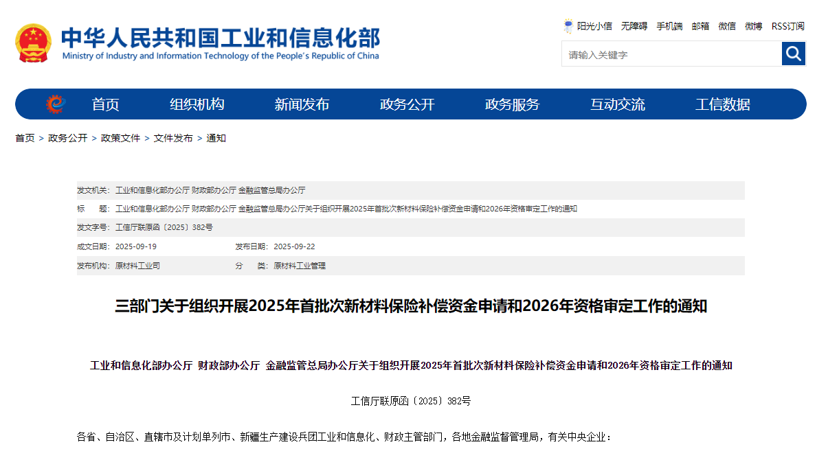 根据首批次新材料保险补偿政策安排,工业和信息化部办公厅、财政部办公厅、金融监管总局办公厅现组织开展2025年首批次新材料保险补偿资金申请和2026年资格审定工作。