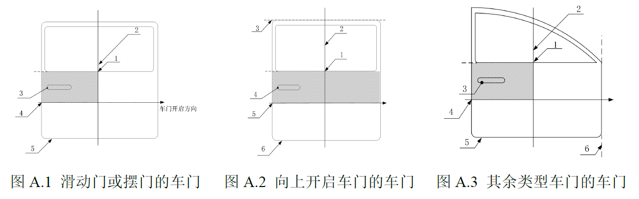 车门外把手应位于车门的阴影区之内或临近阴影区的车门或车门框架附近。滑动门或摆门阴影区位置如图A.1所示,向上旋转开启的车门阴影区位置如图A.2所示,其余类型的车门阴影区位置如图A.3所示。