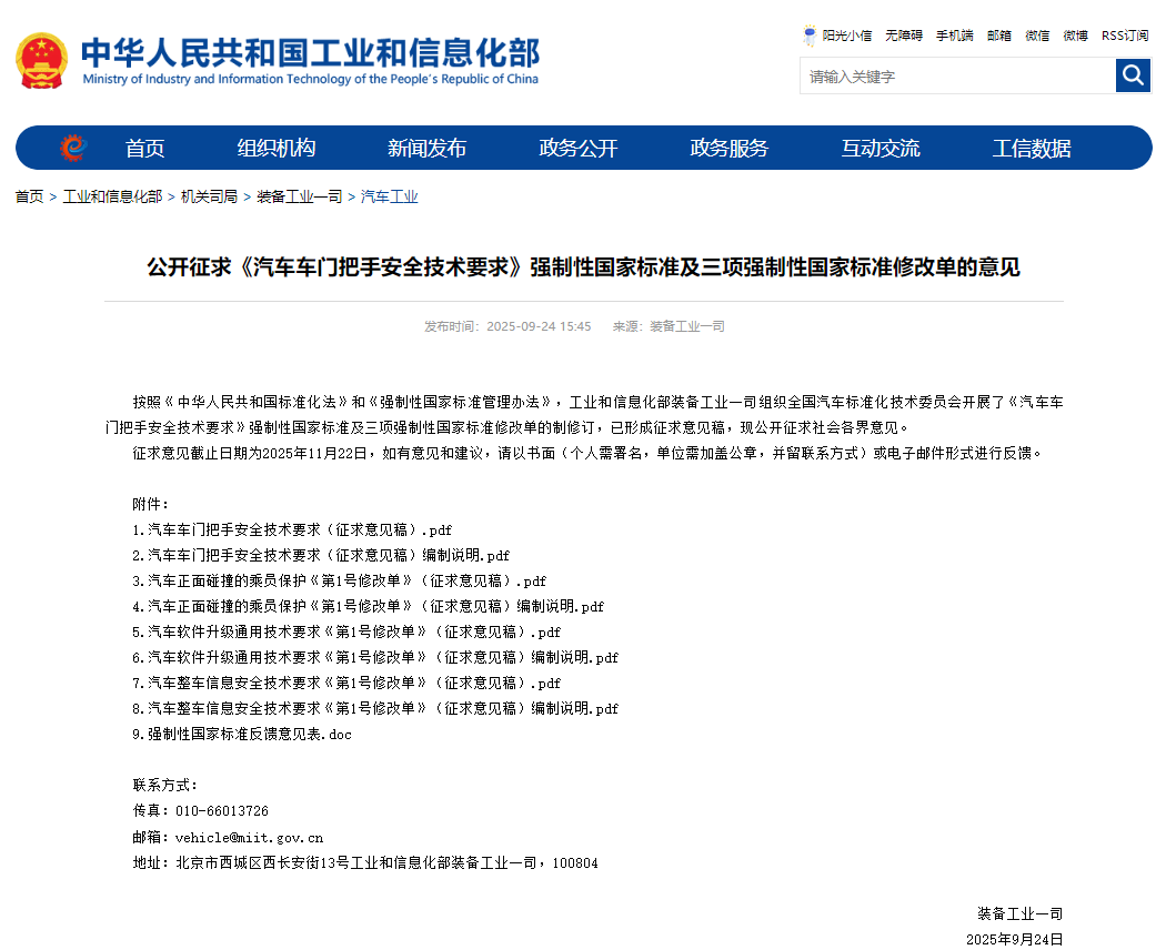 为应对电动隐藏式车门把手新技术、新安全需求,进一步规范和提升车门把手安全性,筑牢汽车安全底线,按照《中华人民共和国标准化法》和《强制性国家标准管理办法》,工业和信息化部装备工业一司组织组织全国汽车标准化技术委员会开展了《汽车车门把手安全技术要求》强制性国家标准的制订工作,已形成征求意见稿,现公开征求社会各界意见。