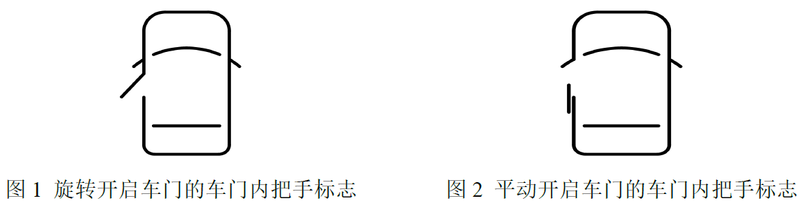 提示标志为图1或图2所示的或镜像的图形,尺寸至少为10mm x 7mm;提示标志布置在无任何遮挡的位置,能够清晰表明车门内把手的位置;提示标志相对于底色易于识别且永久保持;提示标志确保夜间等阴暗情况清晰可见(包括但不限于背光、荧光、外部照明等方式);提示标志线条的粗细、间隙、图形的比例,弧线弧度、导角等细节可进行修改,修改时不改变标志的基本构成要素,不影响使用时的可辨认性,可附加文字描述。