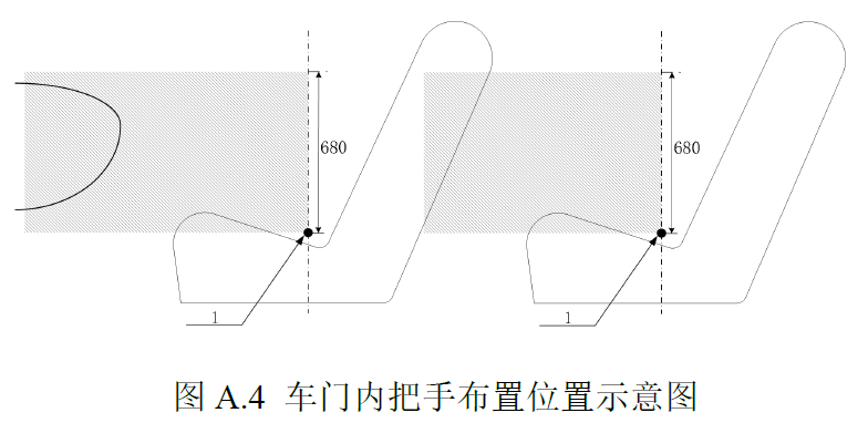 具备机械释放功能的车门内把手应易于车内乘员识别,并满足以下要求:车门内把手应位于无车内构件遮挡的位置,确保在乘员位置直观可见;安装在车门上或距车门不大于300mm的位置;安装在每个车门邻近的外侧座椅R点前方,且R点上方0m至680mm区域内,车门内把手布置示意图如图A.4所示;单个车门配置多个具备机械释放功能的车门内把手时,操作任一车门内把手应能直接开启车门。
