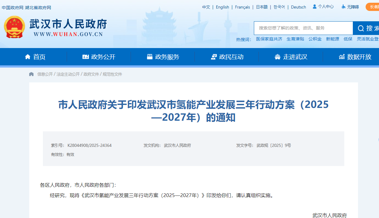 为贯彻落实国家和省关于加快推动氢能产业高质量发展工作部署,构建清洁低碳安全高效的能源体系,培育壮大氢能产业,结合武汉市实际,武汉市人民政府制定《武汉市氢能产业发展三年行动方案(2025—2027年)》(以下简称《方案》)并于近日发布,《方案》明确:力争到2027年,氢燃料电池及汽车研发与应用在国内保持领先地位,燃料电池汽车突破2500辆。