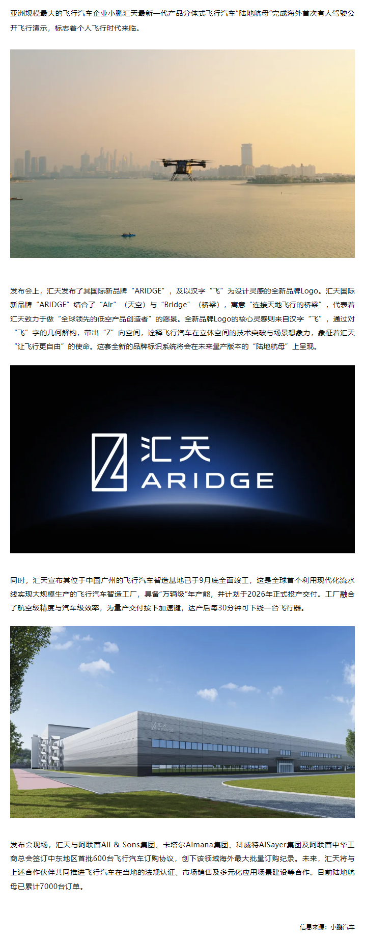 小鹏汇天获中东地区首批600辆飞行汽车订单
