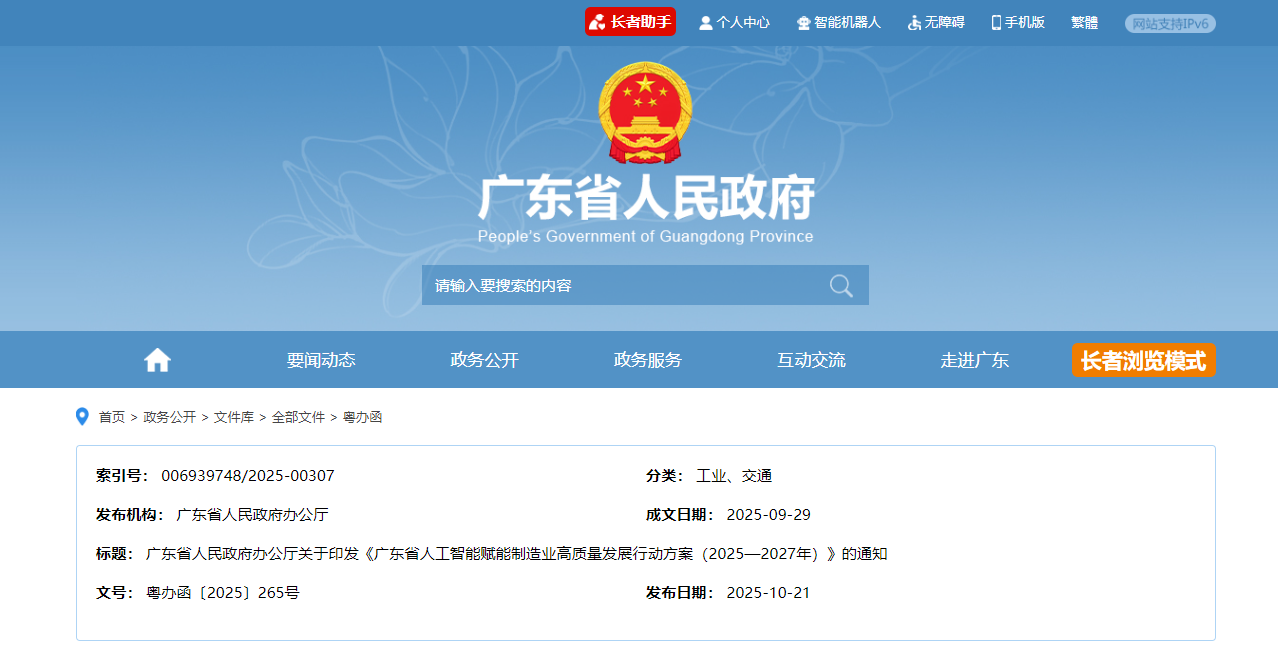 为推动人工智能赋能广东制造,促进制造业数字化转型、智能化跃升,广东省人民政府办公厅制定《广东省人工智能赋能制造业高质量发展行动方案(2025—2027年)》(以下简称《方案》)并于近日发布,《方案》明确: