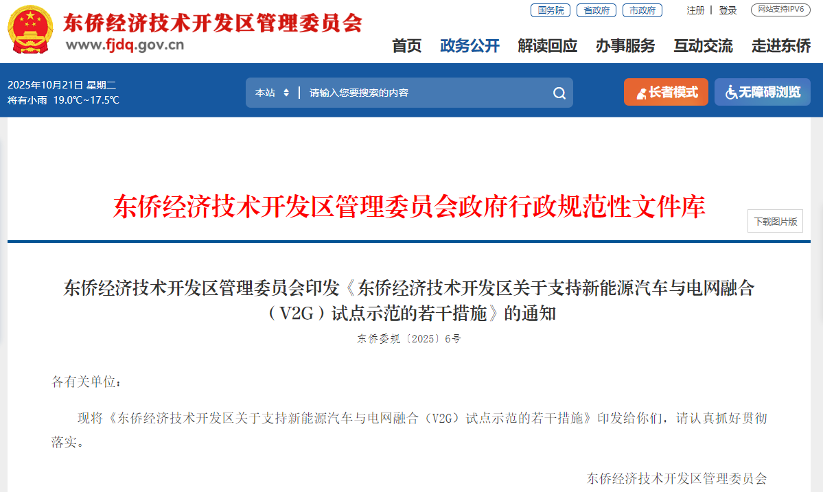 为贯彻落实国家“双碳”战略部署,加快推进我区新能源汽车与新型电力系统协同发展,促进区域绿色能源消纳和电网柔性调节能力提升,打造具有全国影响力的零碳产业示范区,东侨经济技术开发区管理委员会就支持车网互动试点示范工作制定《东侨经济技术开发区关于支持新能源汽车与电网融合(V2G)试点示范的若干措施》(以下简称《措施》)并于近日发布,《措施》明确: