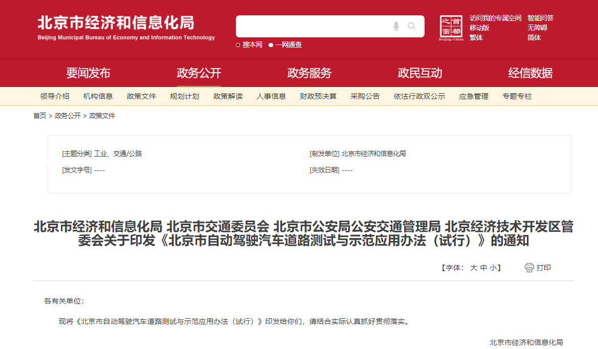 北京市自动驾驶汽车道路测试与示范应用办法(试行)