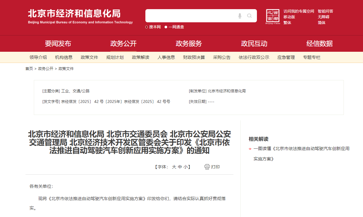 为深入贯彻党中央、国务院关于推动新型工业化、发展新质生产力的决策部署,紧抓战略新兴产业发展机遇,落实《北京市自动驾驶汽车条例》(以下简称《条例》)要求,加快推动本市依法推进自动驾驶汽车创新应用活动,北京市经信局、交通委、公安局、经开区管委会联合制定《北京市依法推进自动驾驶汽车创新应用实施方案》(以下简称《方案》)并于近日发布,《方案》明确: