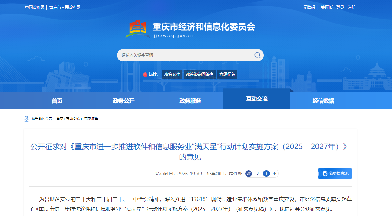 为深入贯彻落实国家软件发展战略和“人工智能+”行动,迭代升级“满天星”行动计划,促进软件和信息服务业(以下简称软信产业)高质量发展,重庆市经济和信息化委员会制定《进一步推进软件和信息服务业“满天星”行动计划实施方案(2025—2027年)(征求意见稿)》(以下简称《征求意见》)并于近日发布。《征求意见》明确: