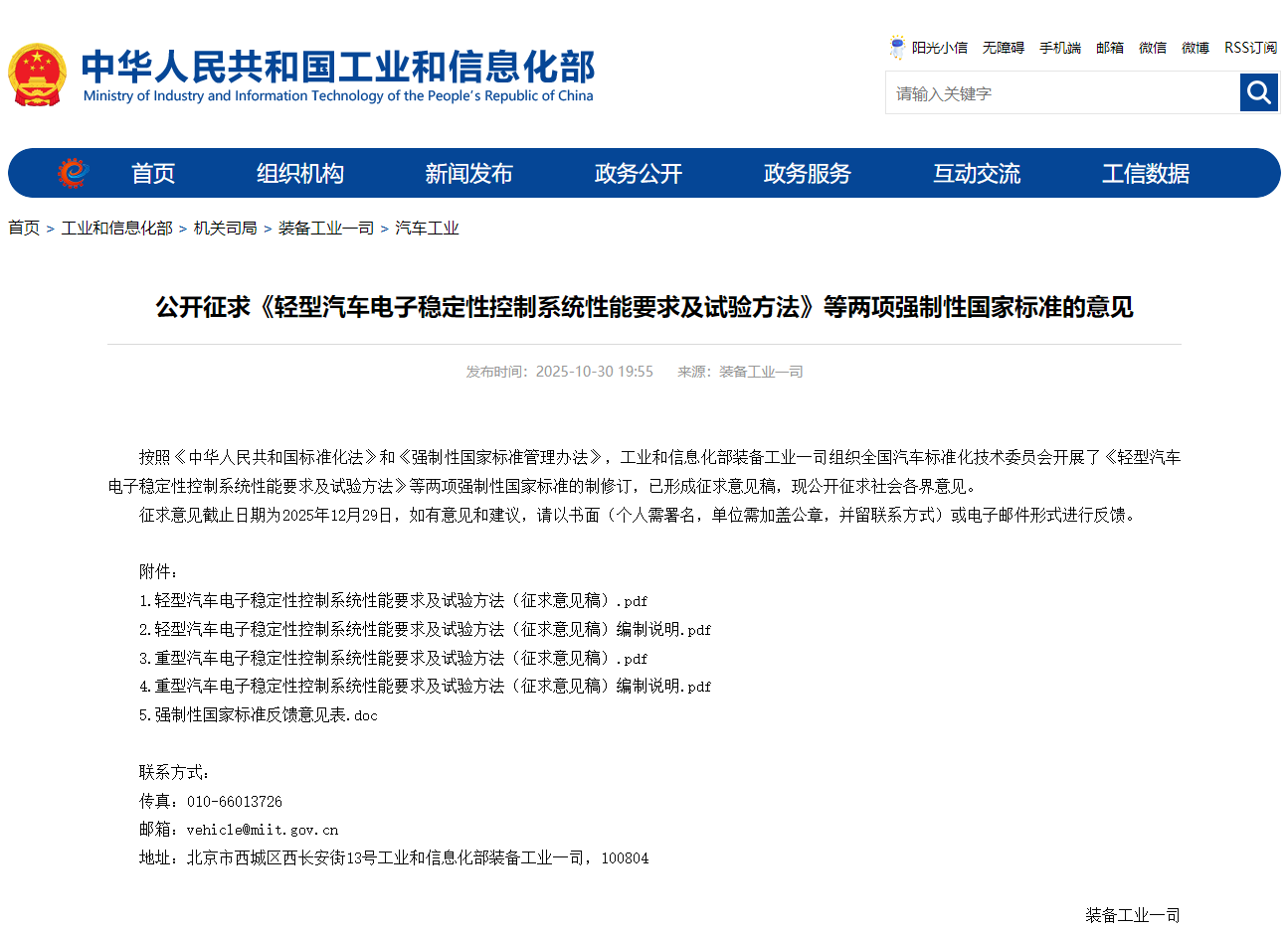按照《中华人民共和国标准化法》和《强制性国家标准管理办法》,工业和信息化部装备工业一司组织全国汽车标准化技术委员会开展了《轻型汽车电子稳定性控制系统性能要求及试验方法》等两项强制性国家标准的制修订,已形成征求意见稿,现公开征求社会各界意见。