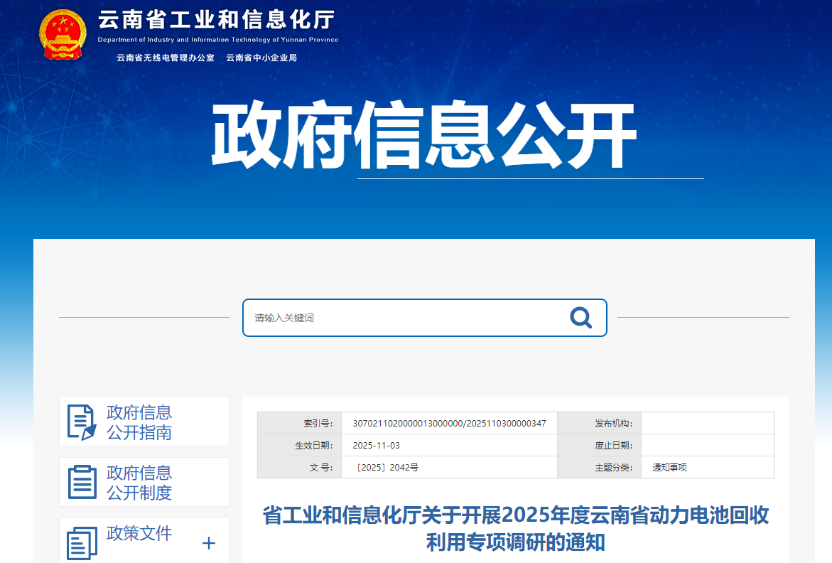 按照工业和信息化部统一安排部署,云南省工业和信息化厅联合第三方机构,即日起开展2025年度云南省动力电池回收利用专项调研工作,要求各州(市)工业和信息化局和动力电池生产、销售、回收利用等相关企业配合做好相关工作。