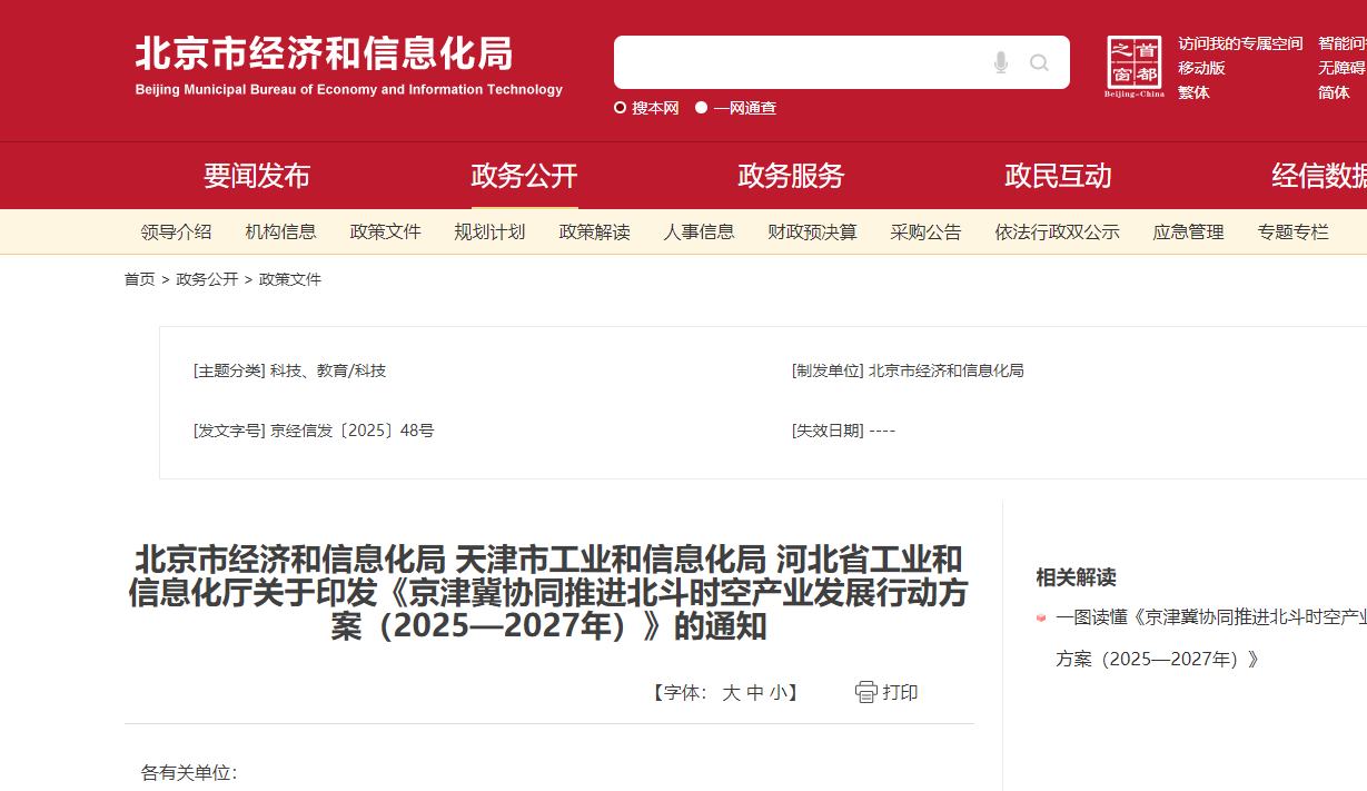 为落实党中央、国务院关于京津冀协同发展的重大战略部署,推进京津冀北斗时空产业高质量发展,着力将京津冀打造成为全国北斗时空产业规模应用策源地、创新示范高地和产业聚集高地,北京市经济和信息化局、天津市工业和信息化局、河北省工业和信息化厅共同制定了《京津冀协同推进北斗时空产业发展行动方案(2025—2027年)》(以下简称《方案》)并于近日发布,《方案》明确: