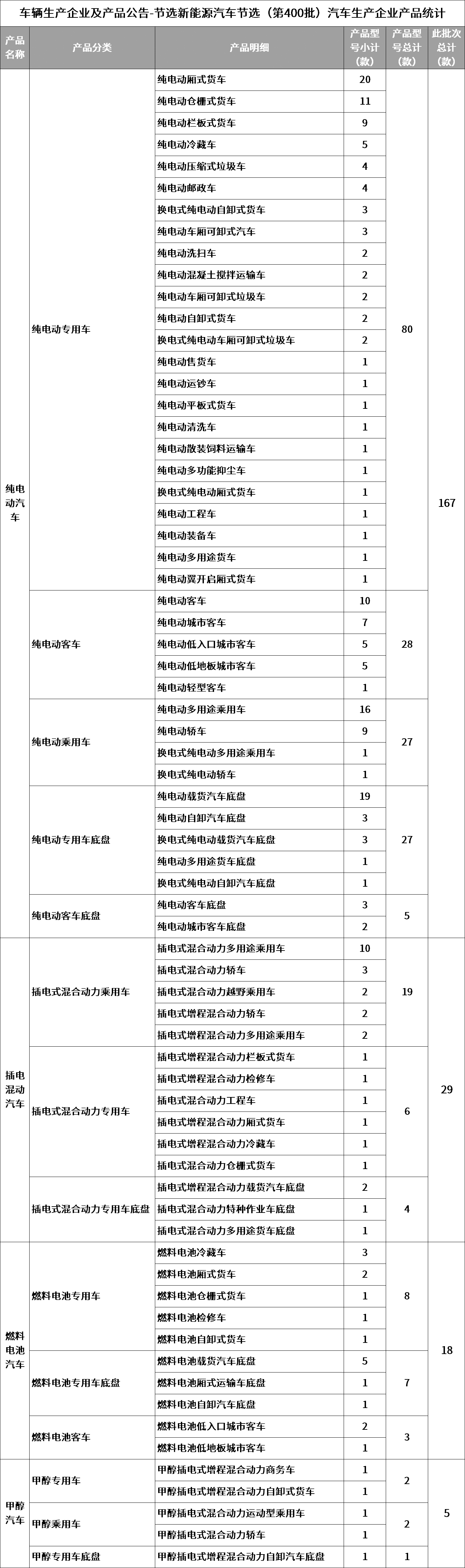 共计81个生产厂家、79个品牌、219个型号进入第400批节能与新能源汽车节选范畴,汽车生产企业新产品类型明细如下表所示。